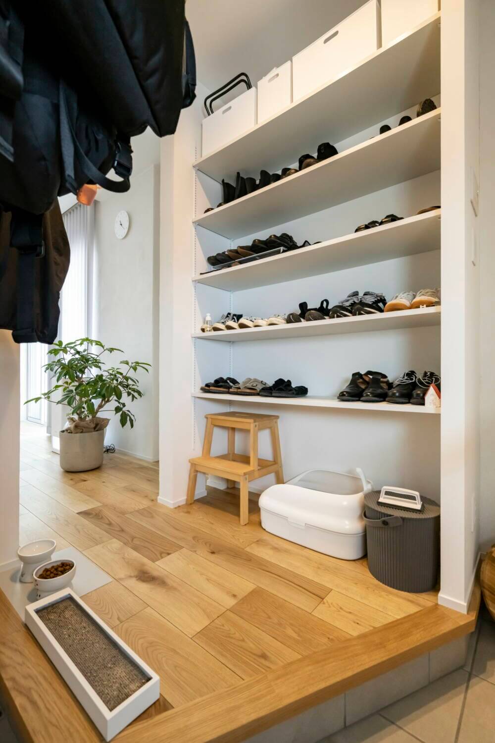 玄関収納は、出発・帰宅動線を考えた設計に。靴はもちろん、カバンや衣服を掛けられるようにしました♪