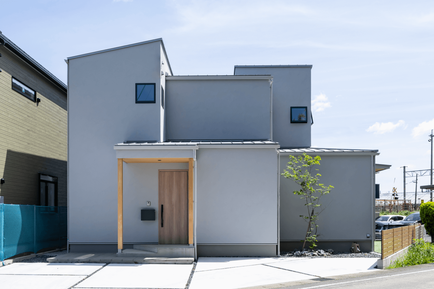 グレーの塗り壁の質感と、軒天の木目という異素材の組み合わせが魅力的な外観。