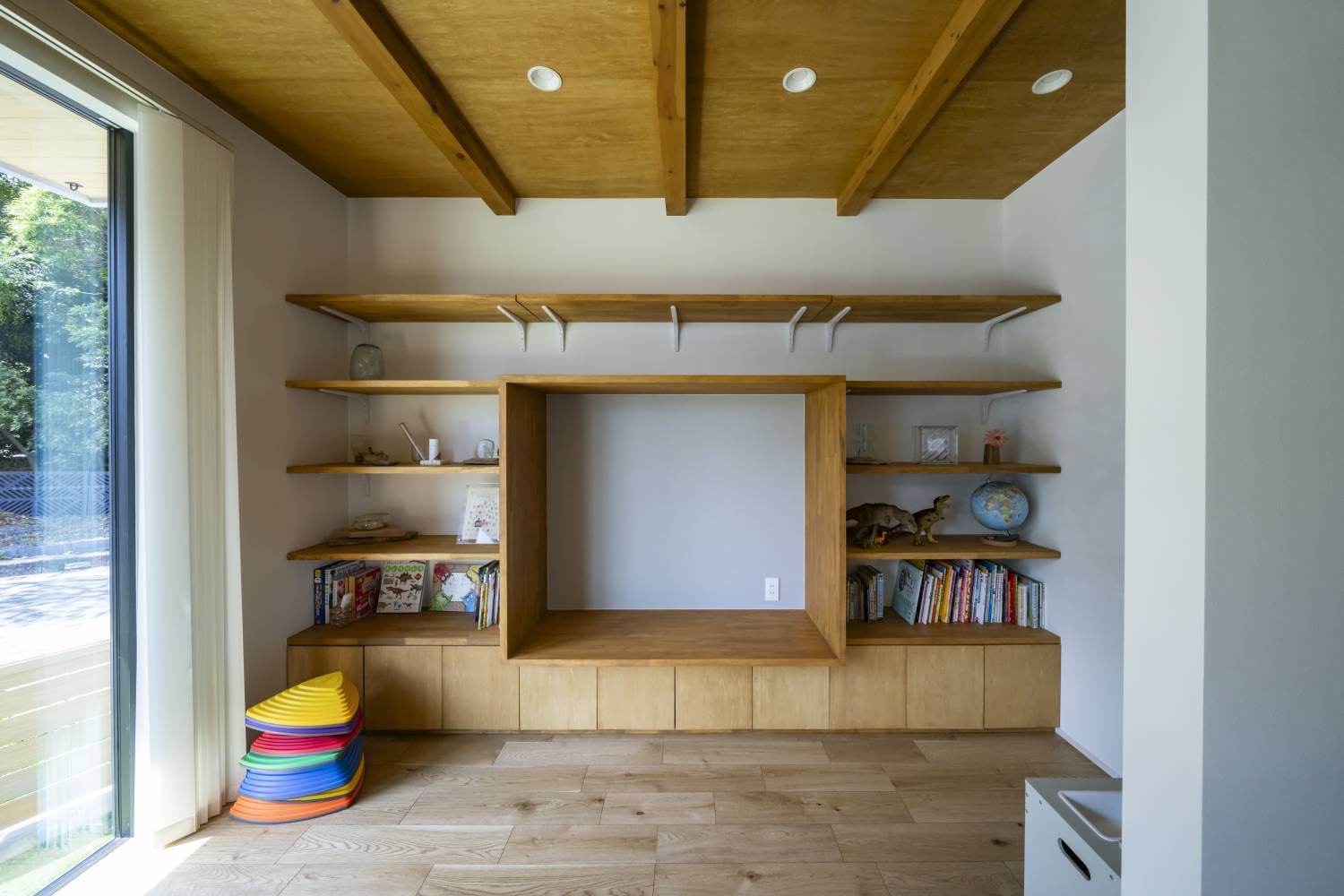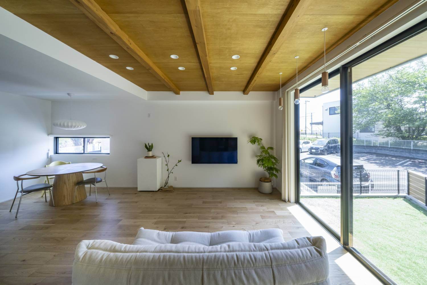 天井に木天井を使い、温かく落ち着いた雰囲気のリビング。