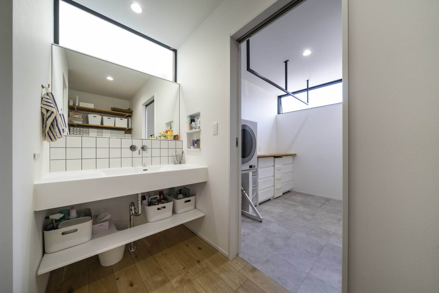 白のタイルをあしらった造作洗面台と、前面上部の窓からの採光で明るい洗面室。