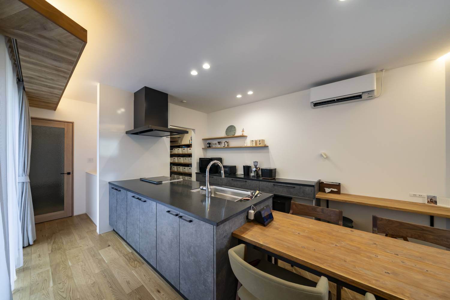 ブラック・濃いグレーを基調とした配色で、LDK空間を引き締めるキッチン。
