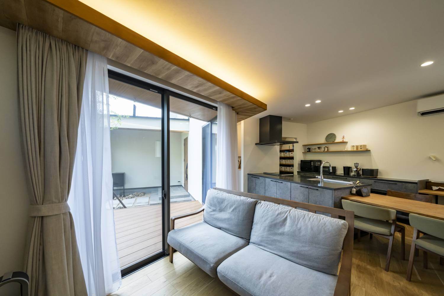 柔らかな間接照明の灯りが安らぎを与えるリビング。