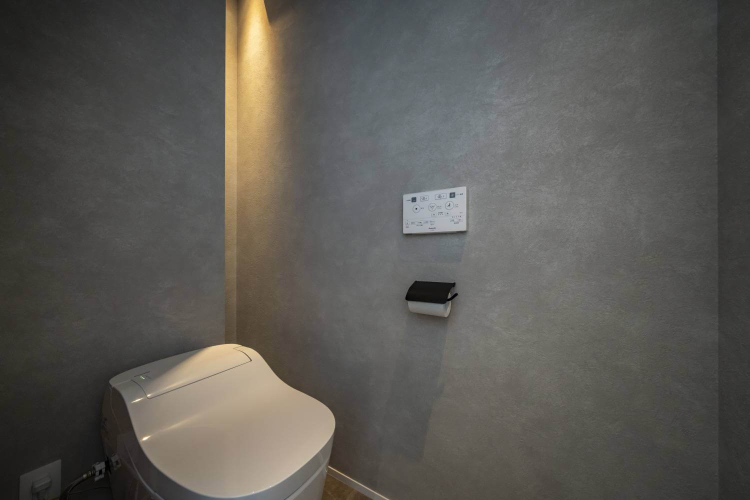 縦の間接照明の柔らかな光が、リラックスできる空間を演出するトイレ。