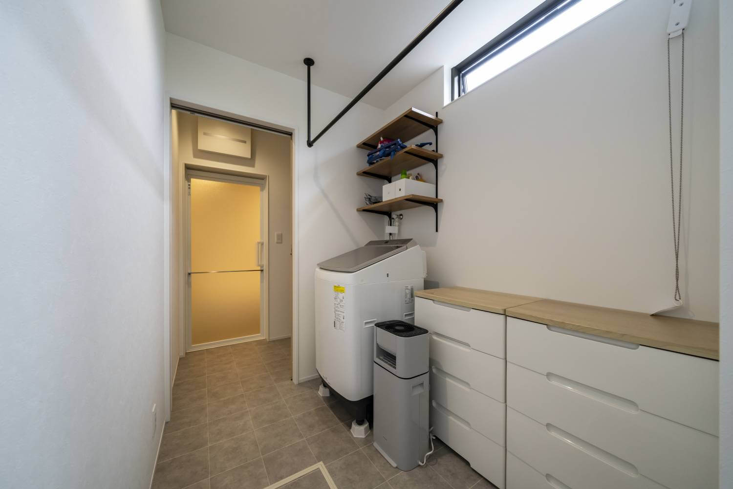 洗濯物の室内干しに便利なコの字アイアンバーを設置し、収納が充実したランドリールーム。