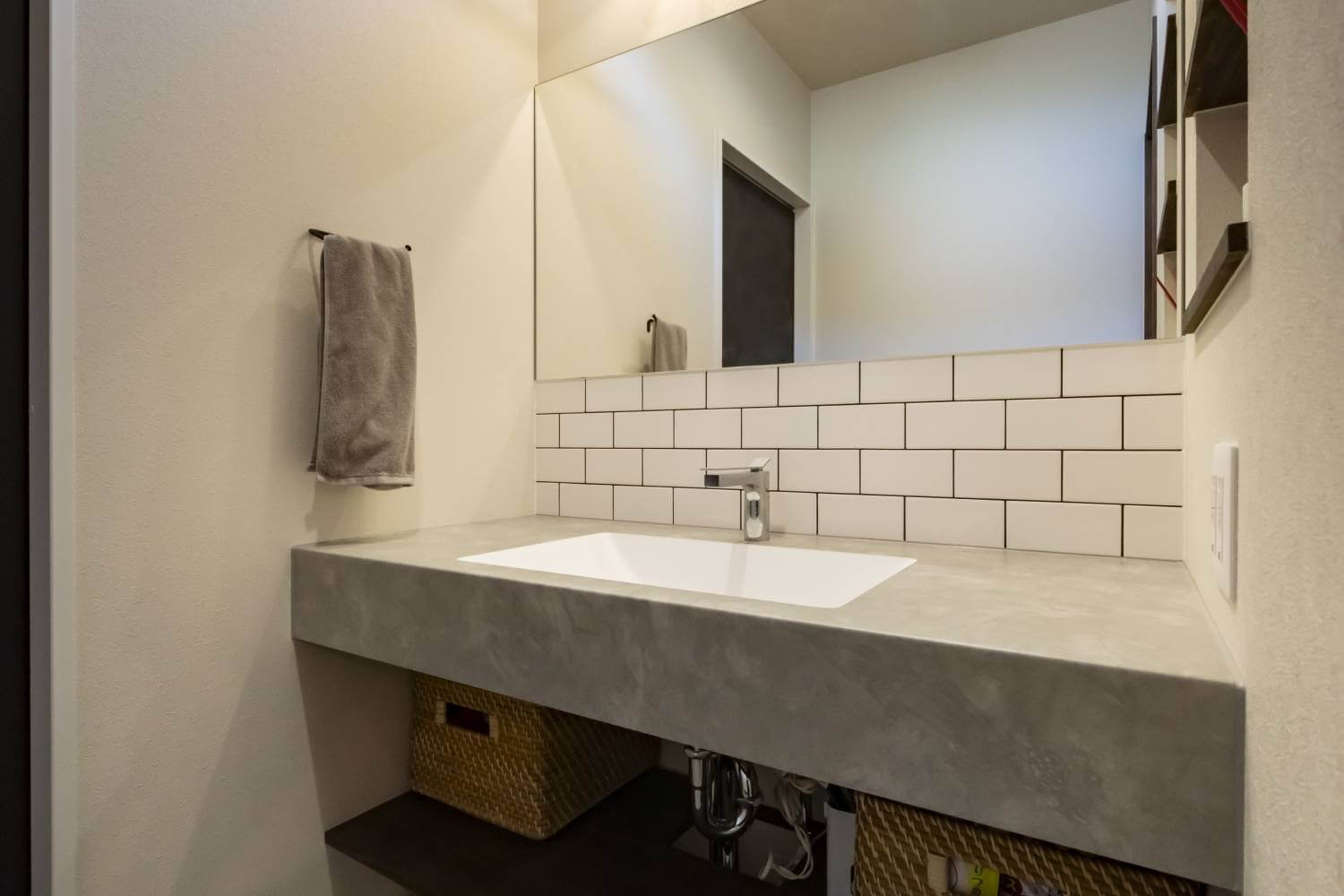 白いレンガ調タイルとコンクリ調の台が、アクセントとなる造作洗面台。