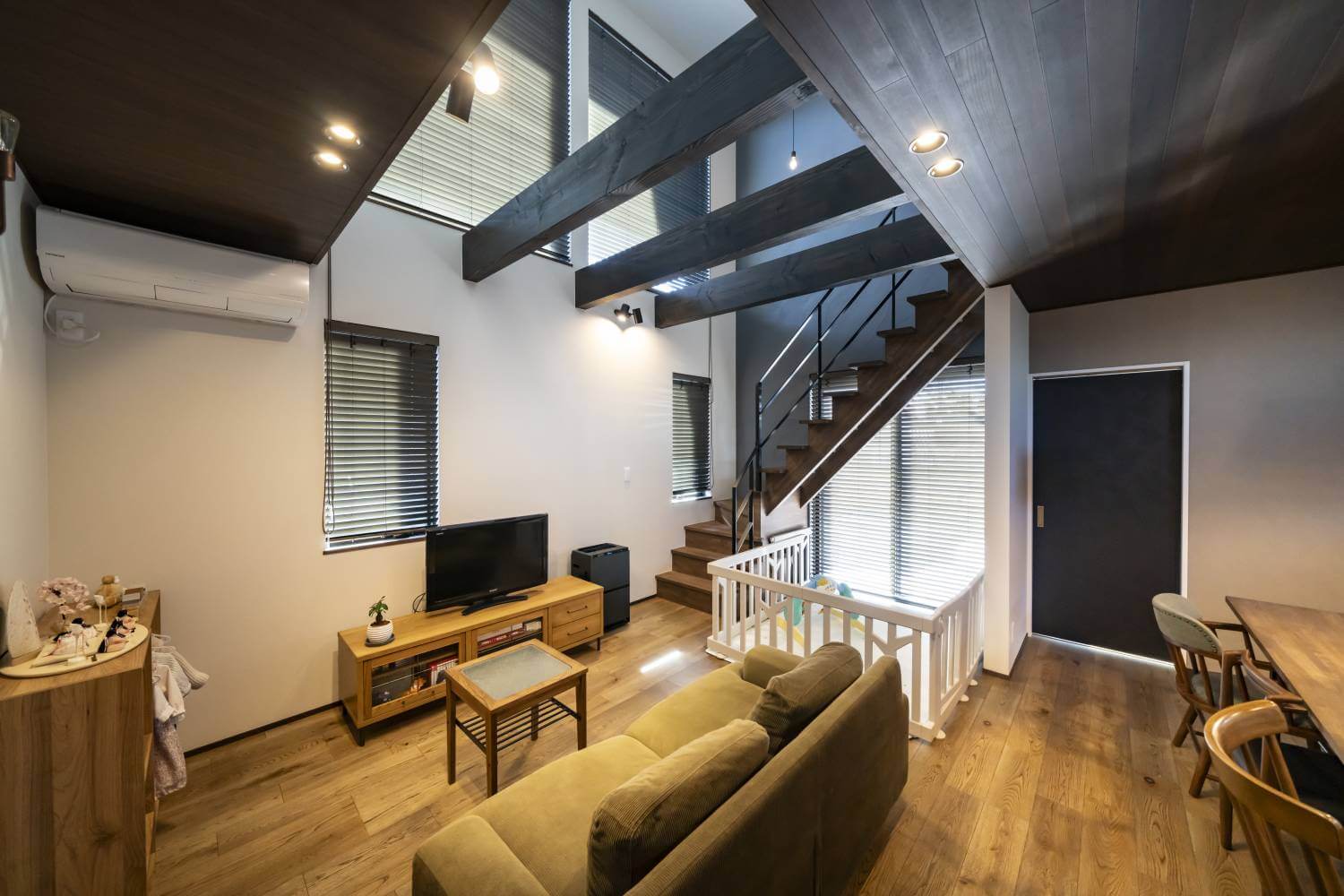 化粧梁と木天井がアクセントとなり、温もりを演出するリビング。