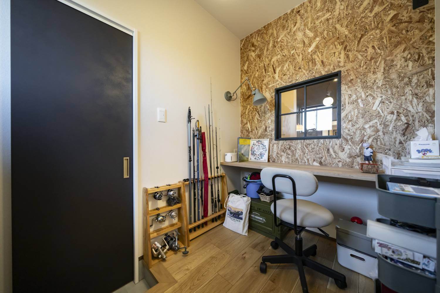 ラフな質感のOSBボードの壁が、インダストリアルな印象を与える趣味室。