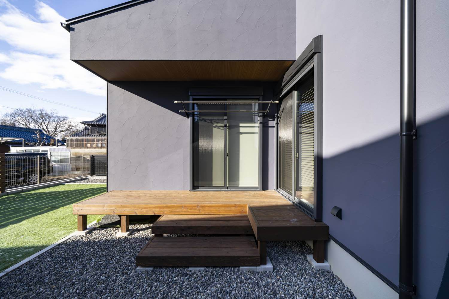 洗濯物がほせる実用的な機能と、木軒天井がデザイン性を兼ね備えたウッドデッキ。