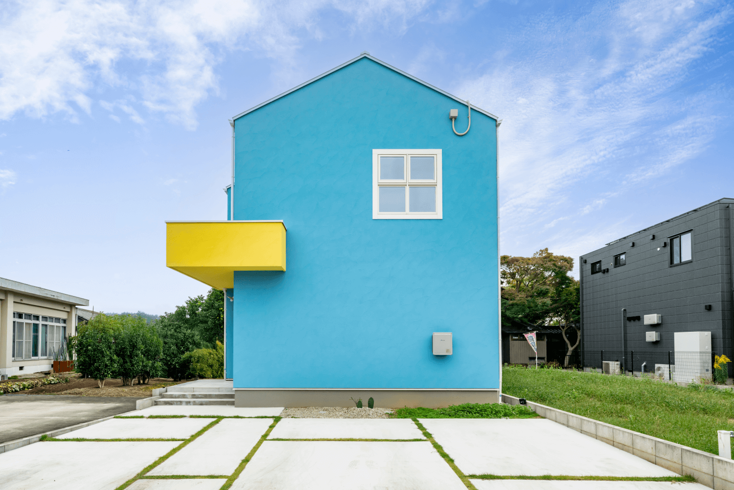 ブルーの外壁にイエローの庇が映えるポップなデザイン。