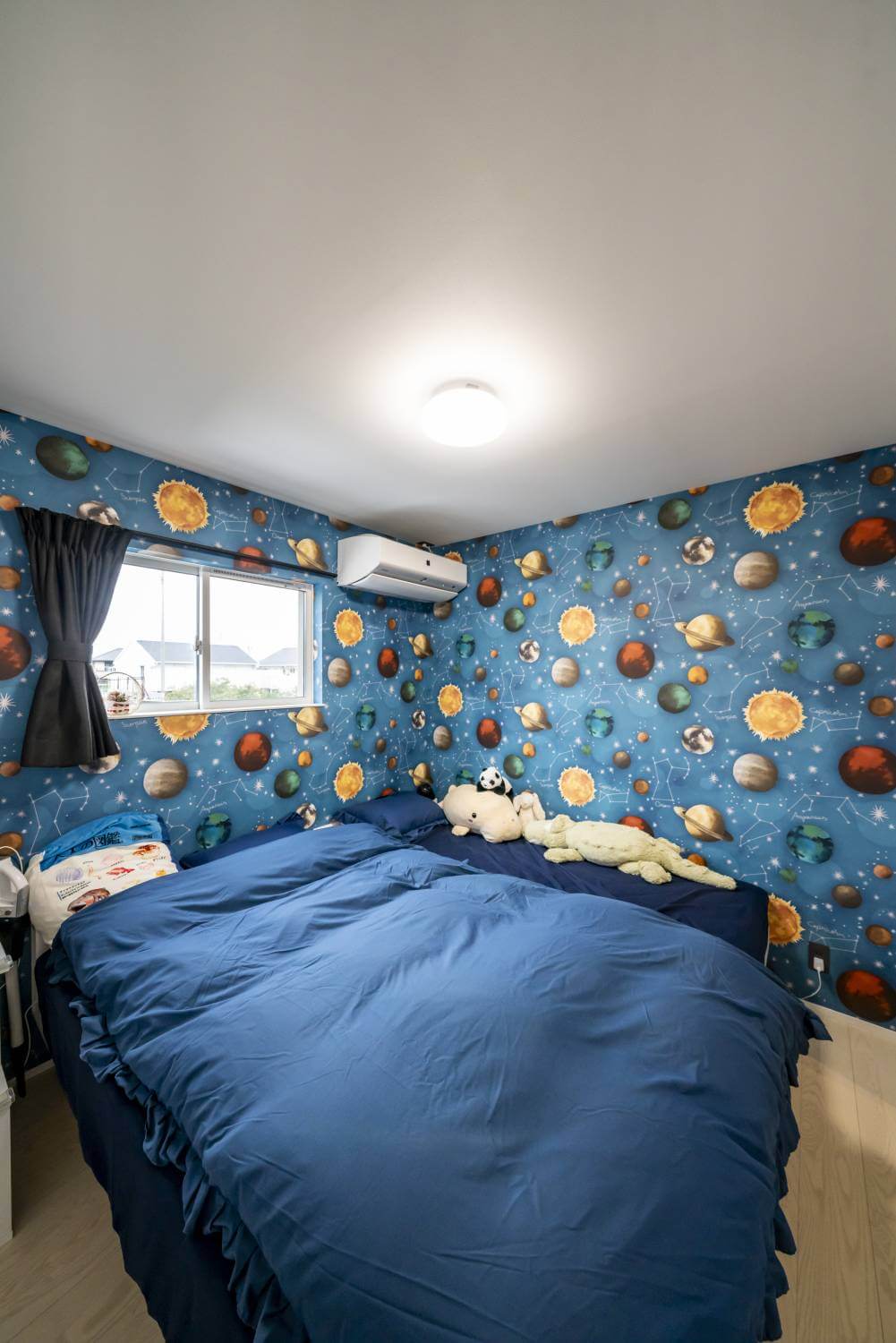宇宙柄のクロスが特徴的な、ブルーを基調とした幻想的な空間。