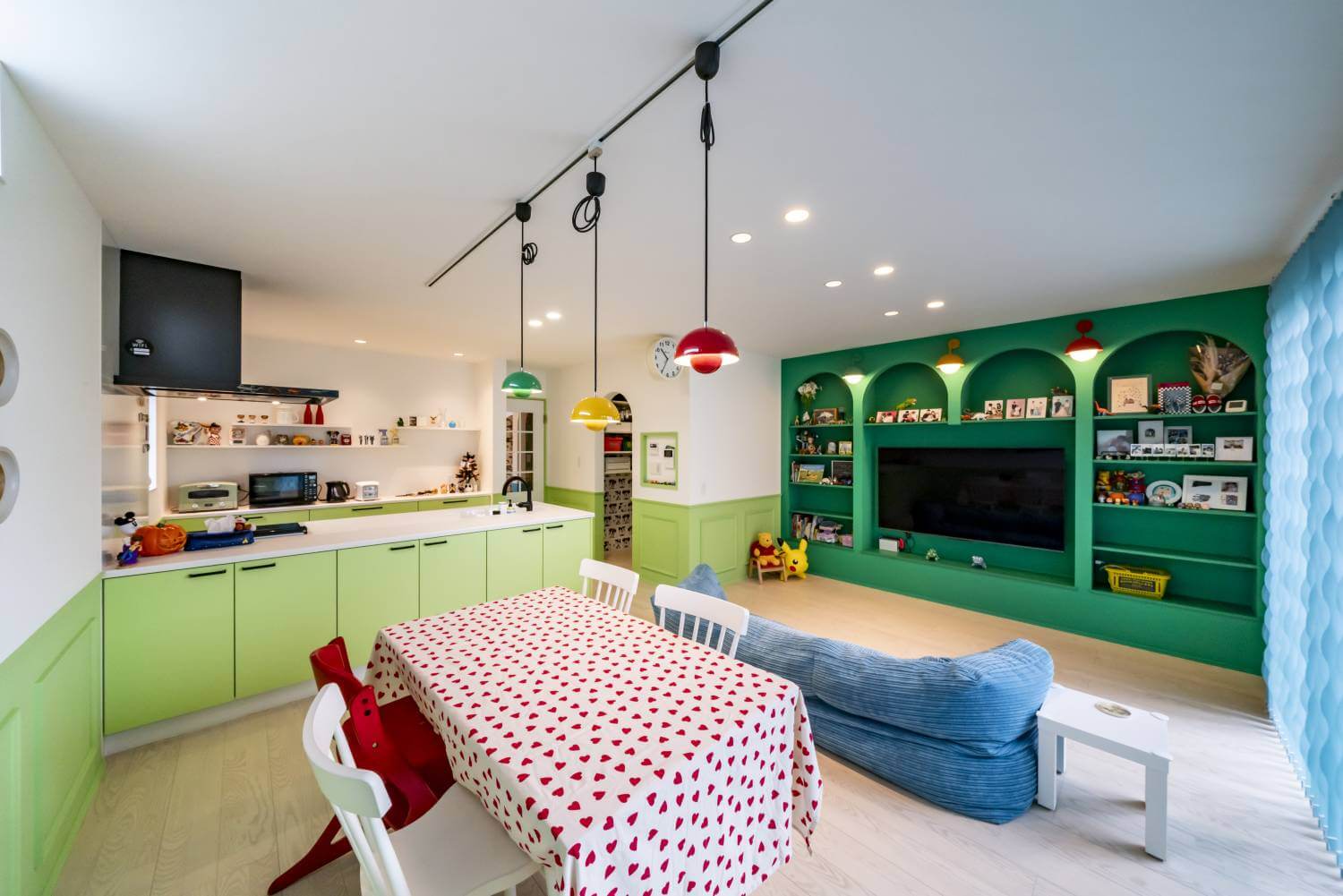 赤・黄・緑のカラフルな照明が目を引くダイニング。