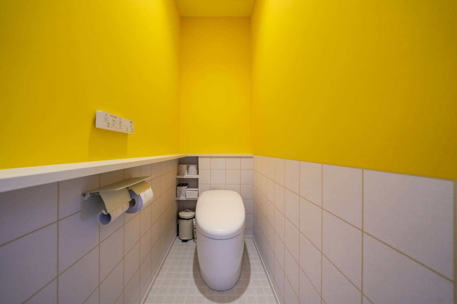 イエローとホワイトでまとめた、明るくポップな雰囲気のトイレ。
