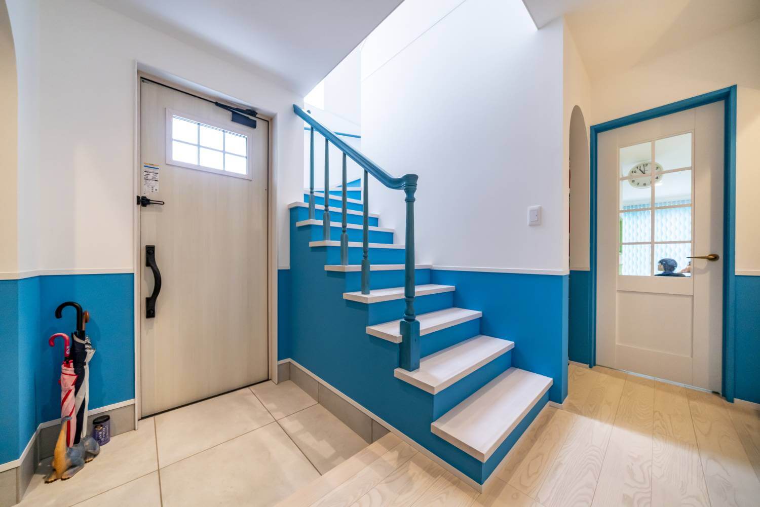 ブルー×ホワイトの爽やかな配色の玄関。