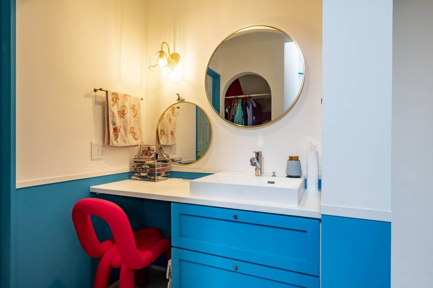 大小2枚の円形ミラーを組み合わせたおしゃれで便利な洗面スペース。