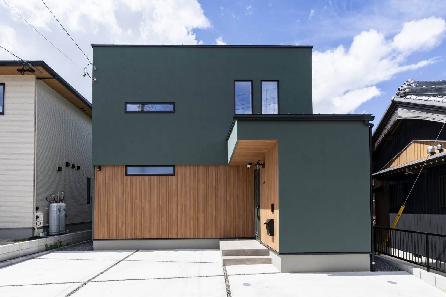 緑の塗り壁に合わせた同色のドアが一体感を生み、木の板張りサイディングがアクセントになっています。