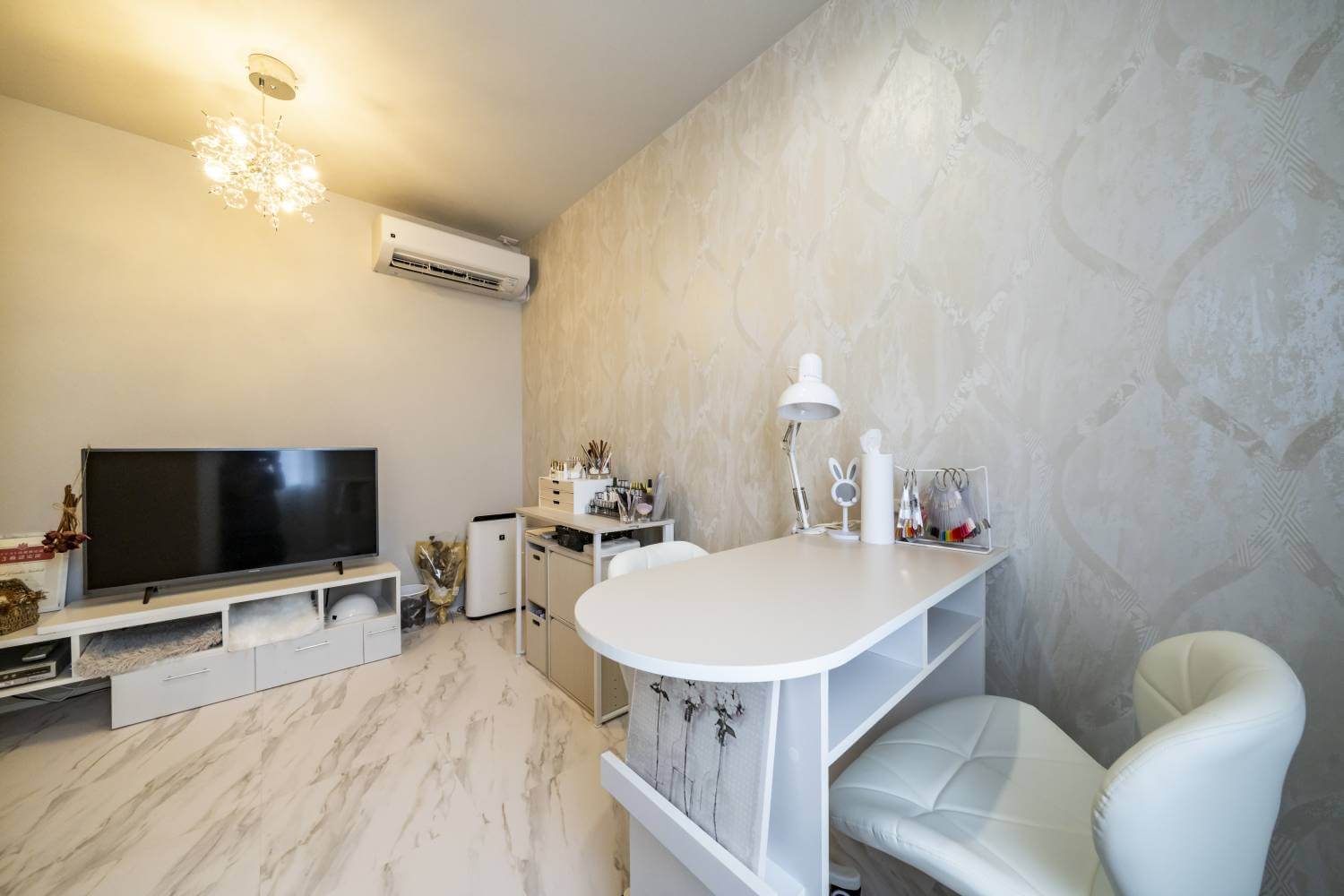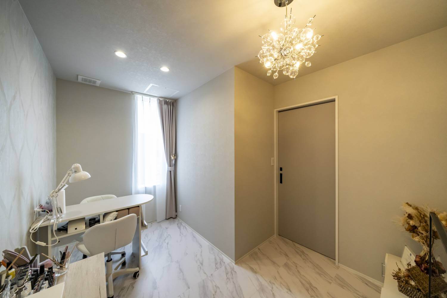 フロアタイルと落ち着いた色のクロスが生み出す、上品なサロンルーム。