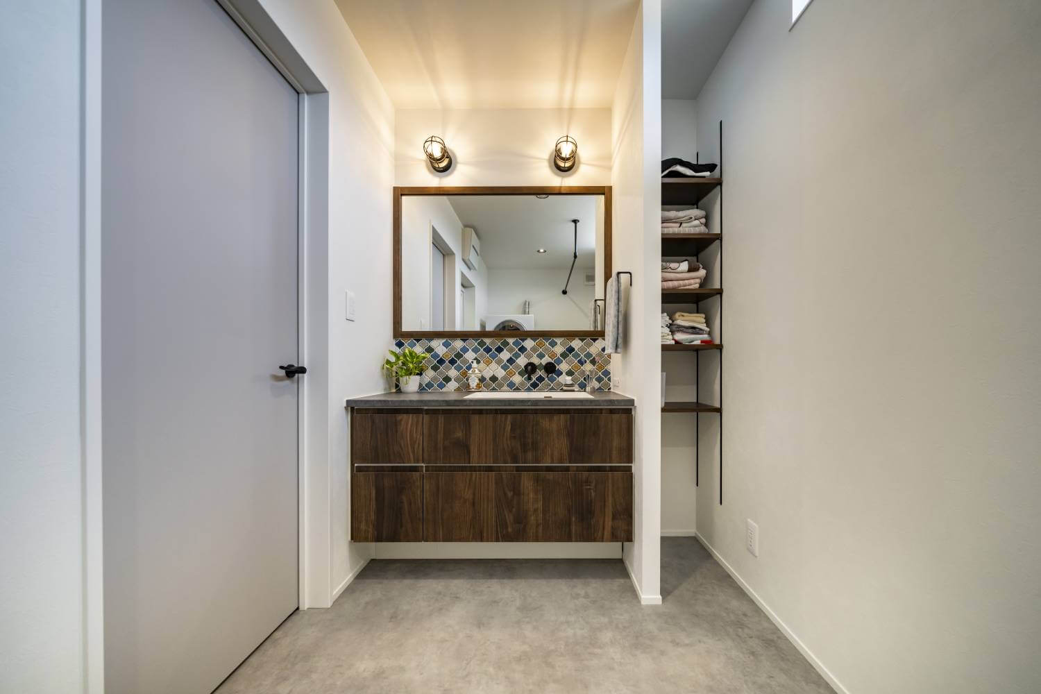 シンプルなトーンの空間に、素材感のある造作洗面を設けました。
