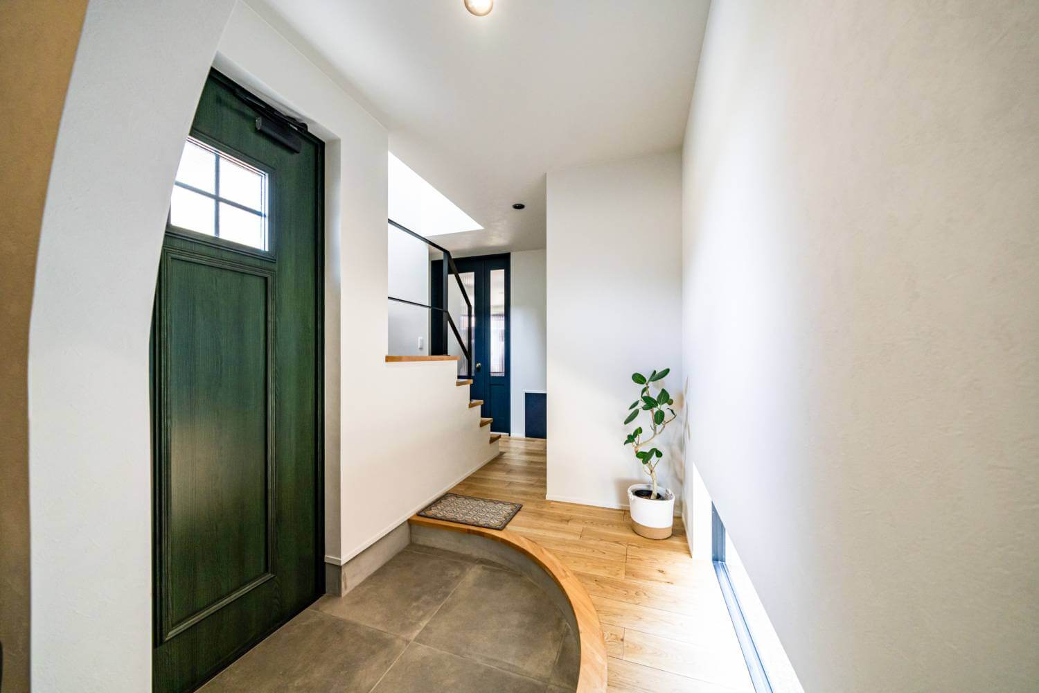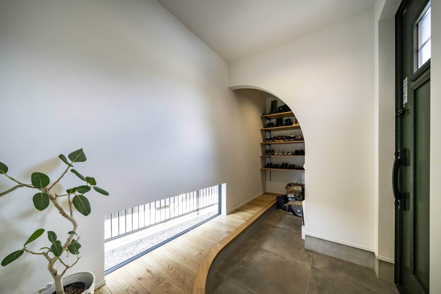 地窓から差し込む自然光が玄関に抜け感をもたらし、空間にやわらかな陰影を描きます。