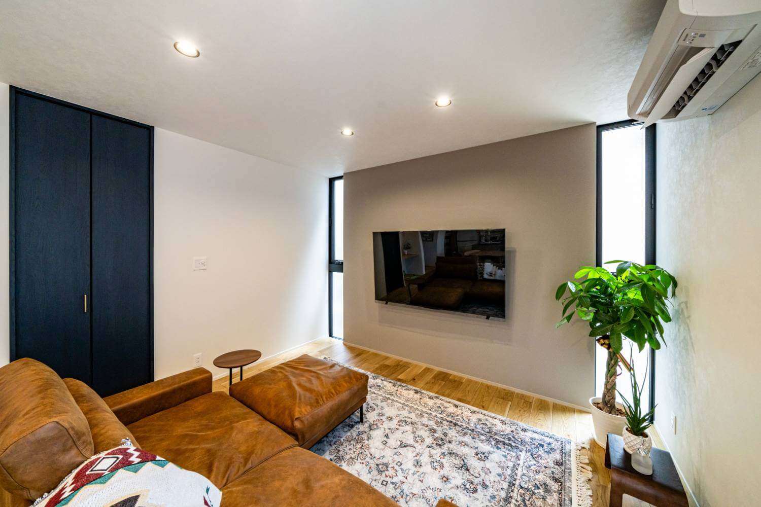 テレビ横のスリット窓からは柔らかな光が入り、日中は照明要らずの心地よい空間が広がります。