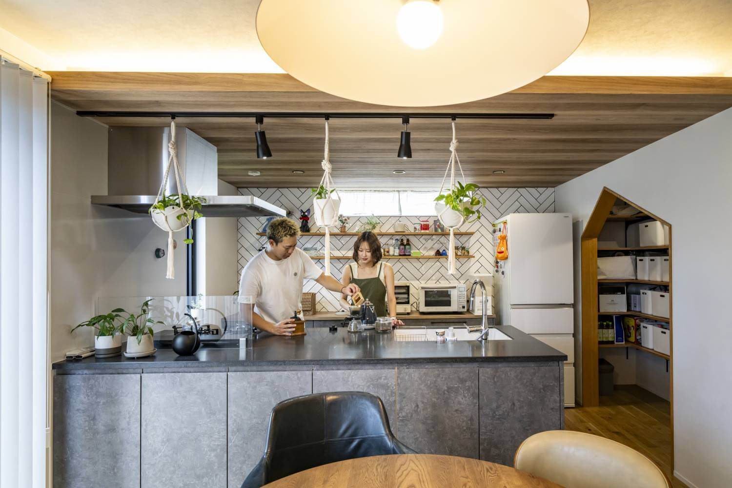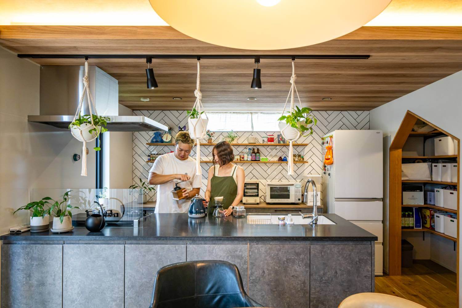 フルフラットで視線が抜け、ブラックの天板が空間を引き締めるキッチン。