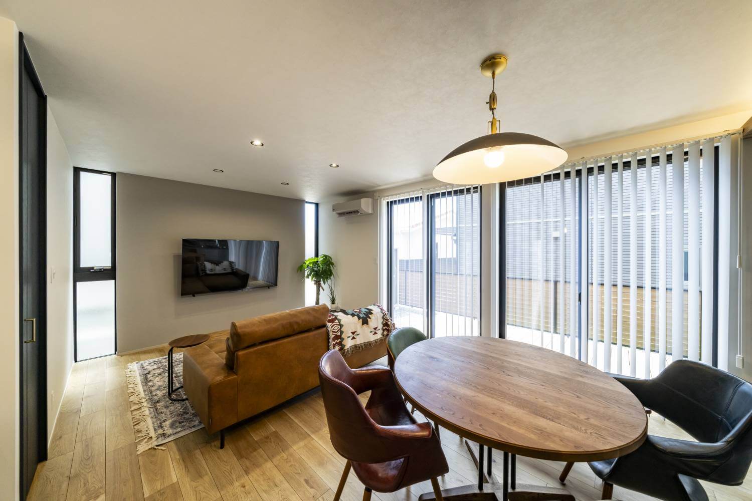 革のソファと木のぬくもりが調和する、ナチュラルヴィンテージのリビング。