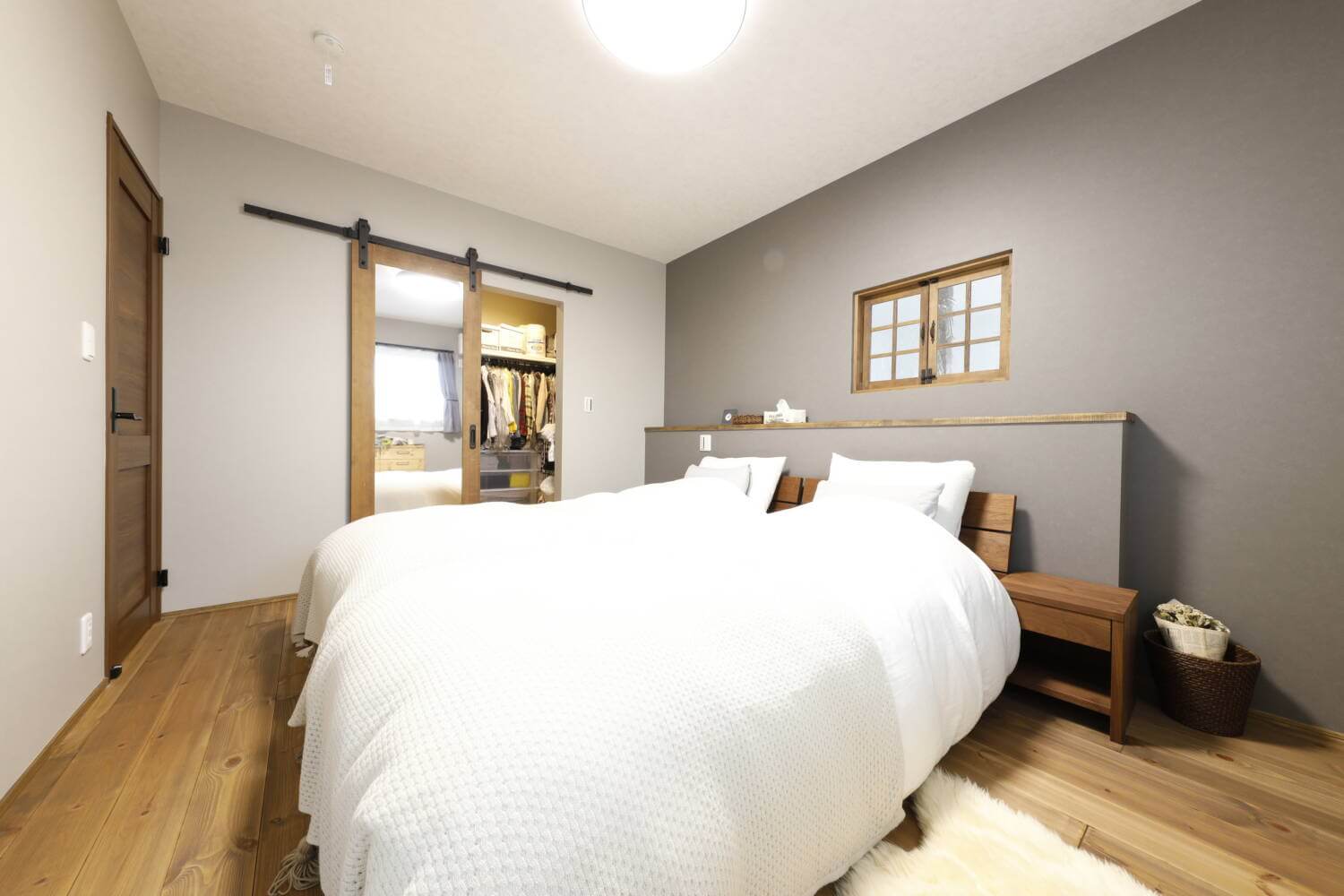 広々のメインのベッドルームは落ち着いたトーンに仕上げました。