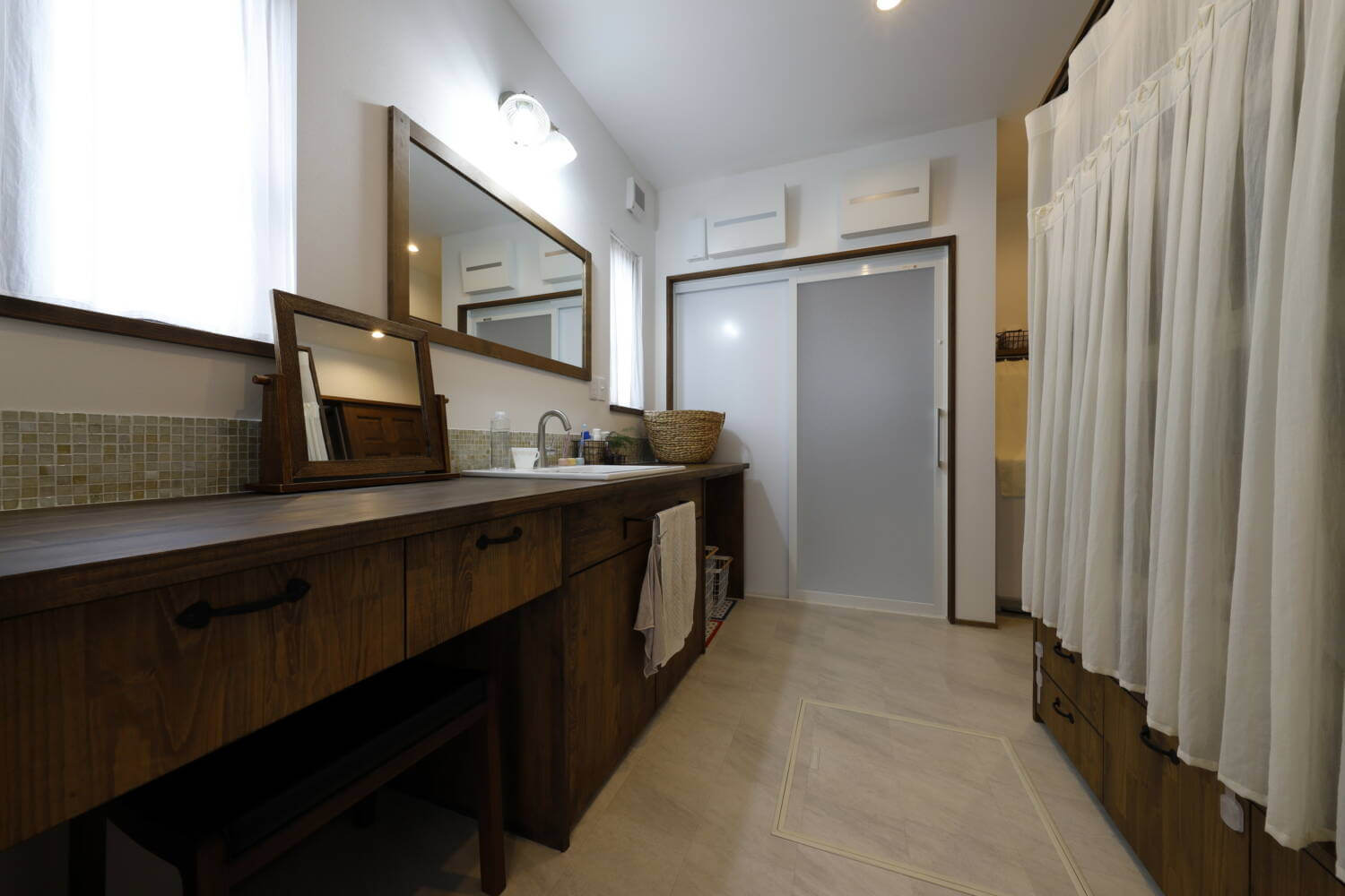 洗面がほとんどを造作家具で作りこみ、オリジナル仕様に