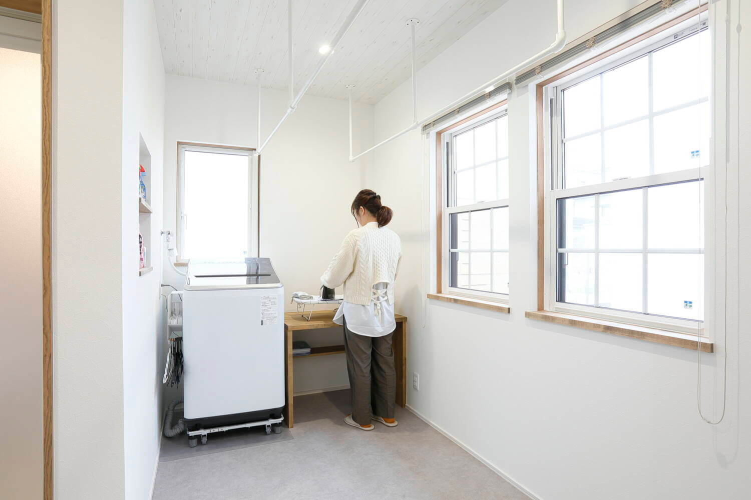 脱衣所はとにかく広く設けて、一部をランドリースペースに。日差しの確保もバッチリです!