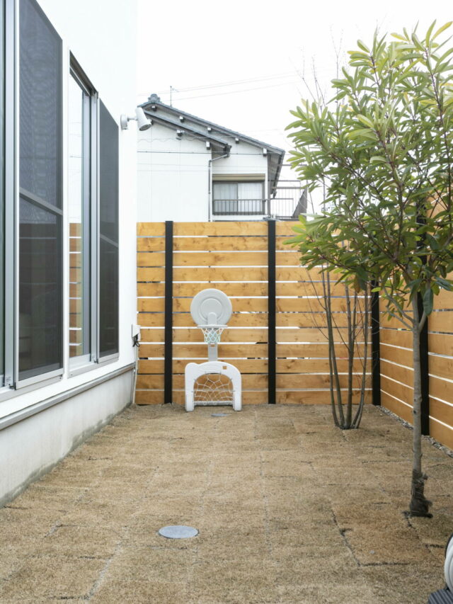 木フェンスの奥にはちょっとしたお庭を設けました。周りの目を気にせずに遊べる空間に。