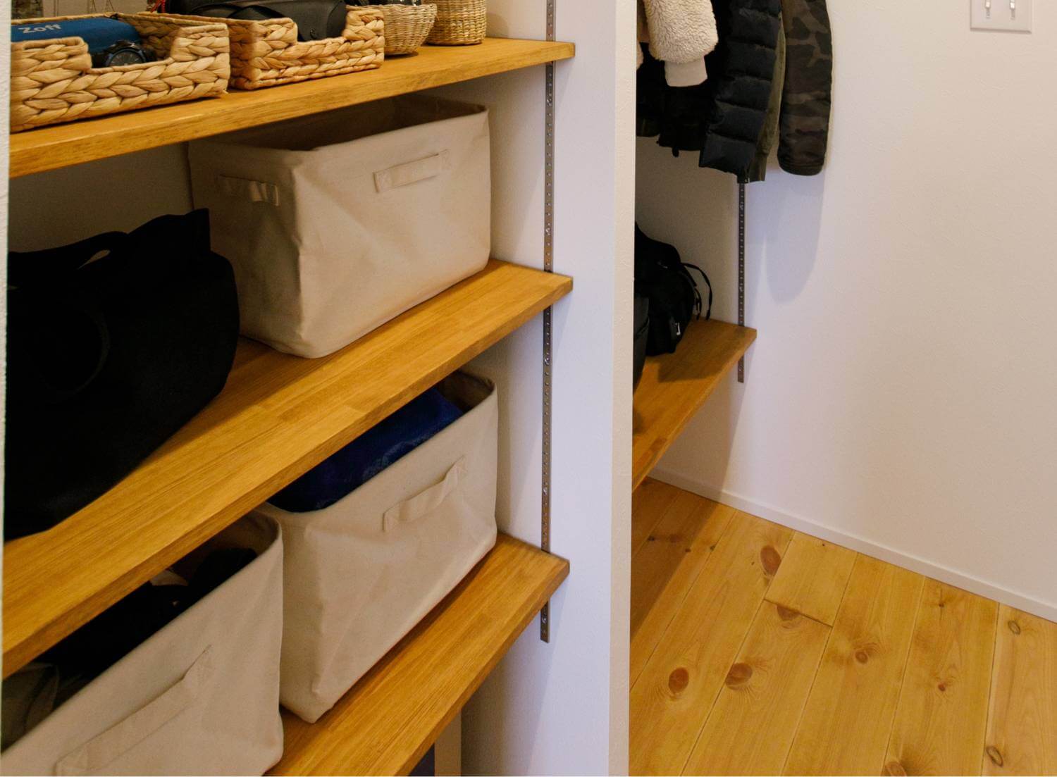 L字に設けた玄関は、奥に収納スペースを設けることで、外出時や帰宅時に使いやすいレイアウトに。
