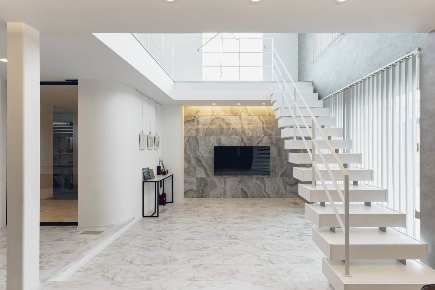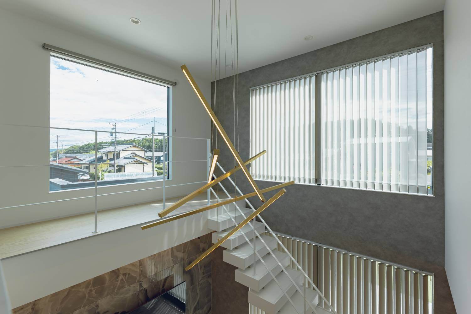 吹き抜けに設置されたフロート階段は浮遊感のある非日常的なデザインに。