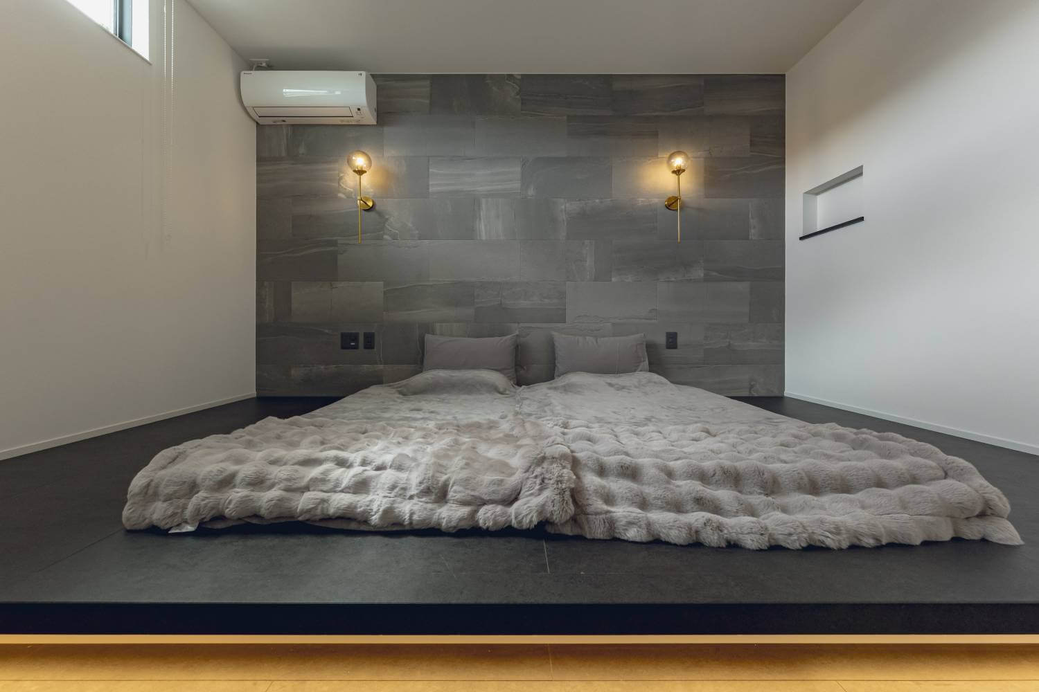 暖色の間接照明がやわらかく足元を照らす、主寝室。