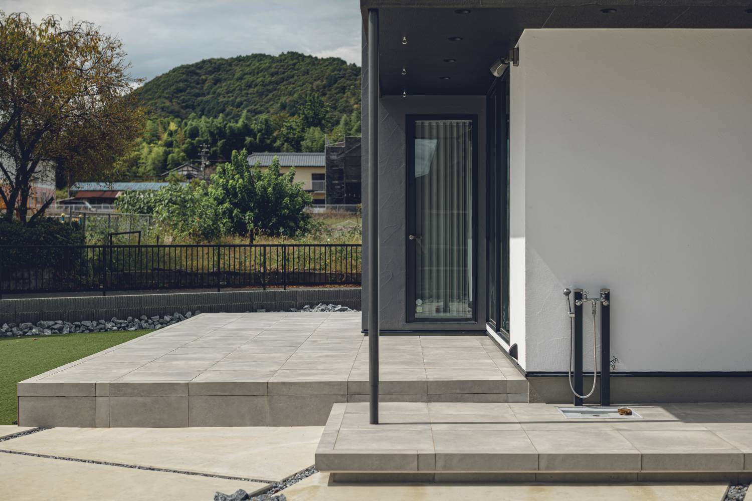 3色のモノトーンの塗り壁で構成されたキューブが美しい外観。
