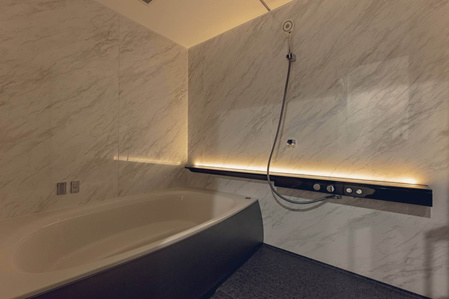 シンプルなトーンでまとめつつ、石目調の床材や足元の間接照明が品のある玄関をつくりあげています。