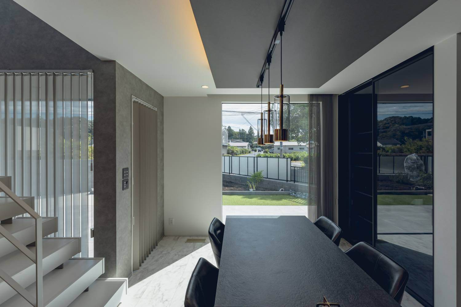上品なペンダントライトが食卓をやさしく照らし、いつもの食事が特別なひとときへと変わります。