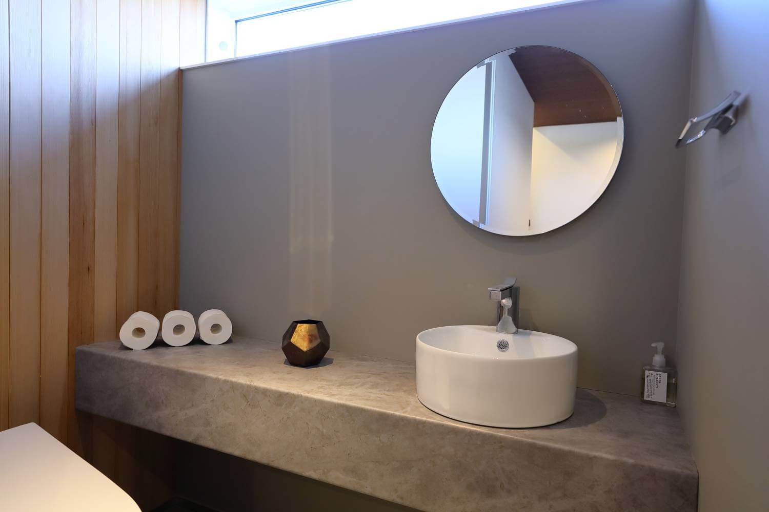 大理石調の天板とブルーのタイルでホテルライクな空間となっています。